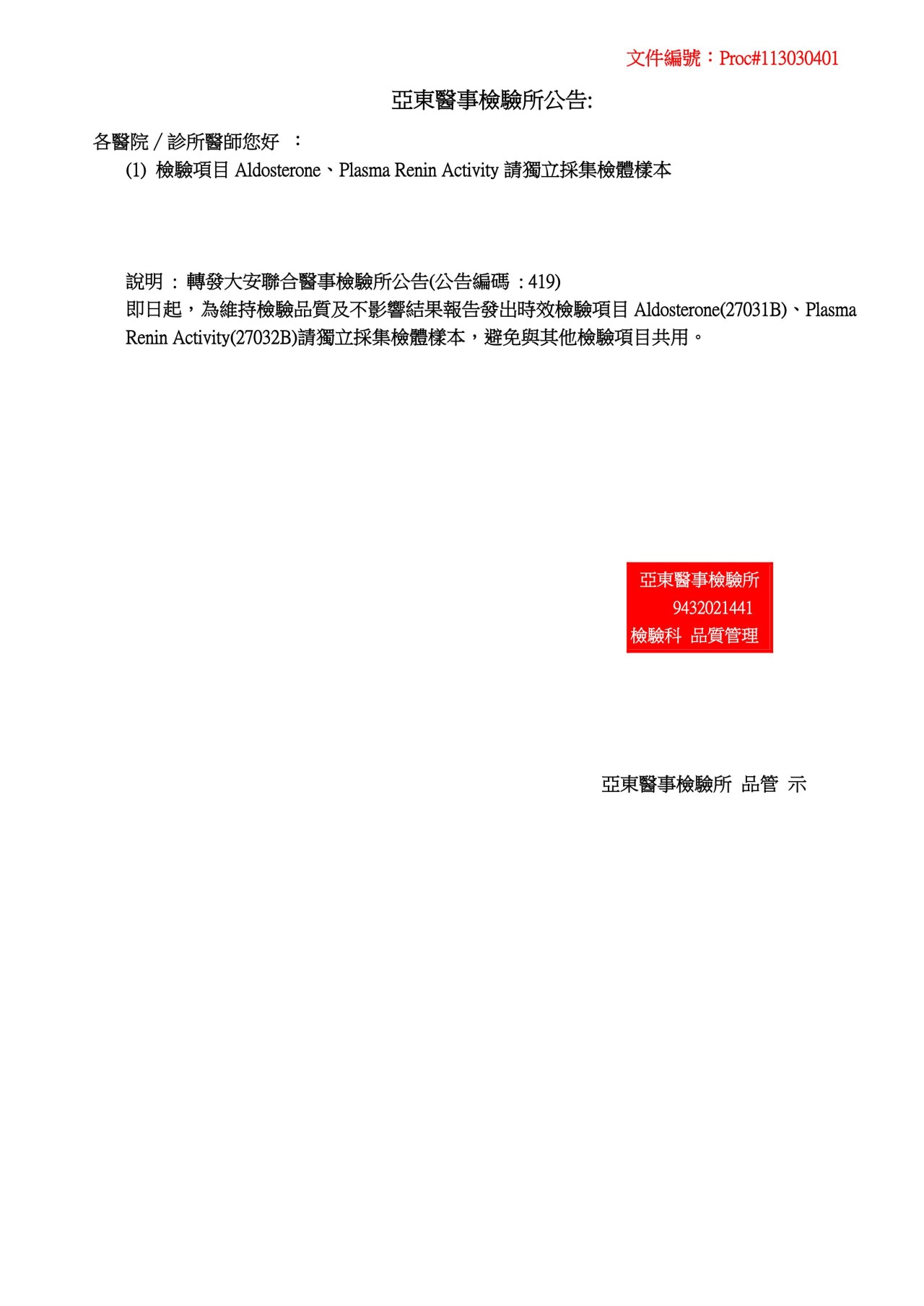 公告 檢驗項目Aldosterone、 Plasma Renin Activity請獨立採集檢體樣本