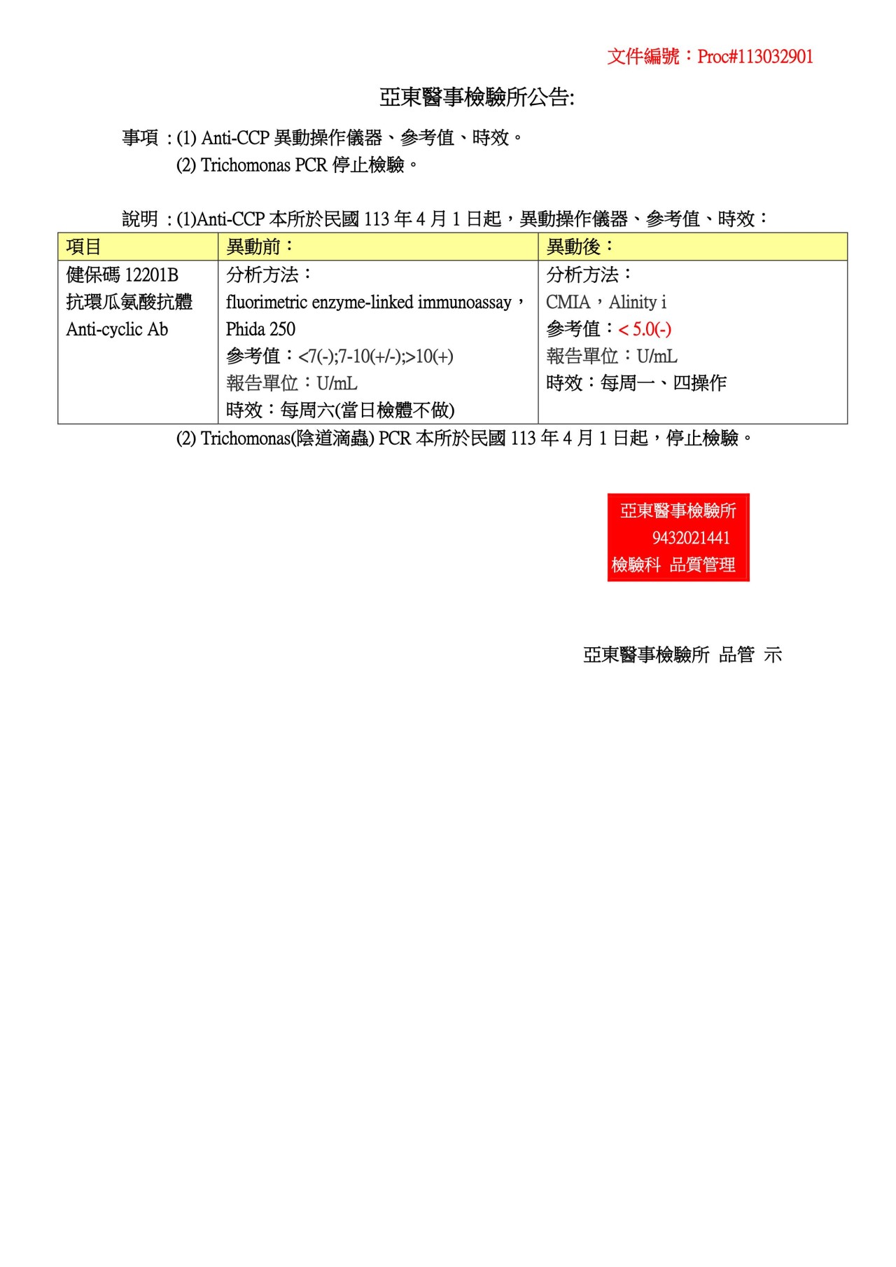 公告 (1) Anti-CCP異動操作儀器、參考值、時效。 (2) Trichomonas PCR停止檢驗。