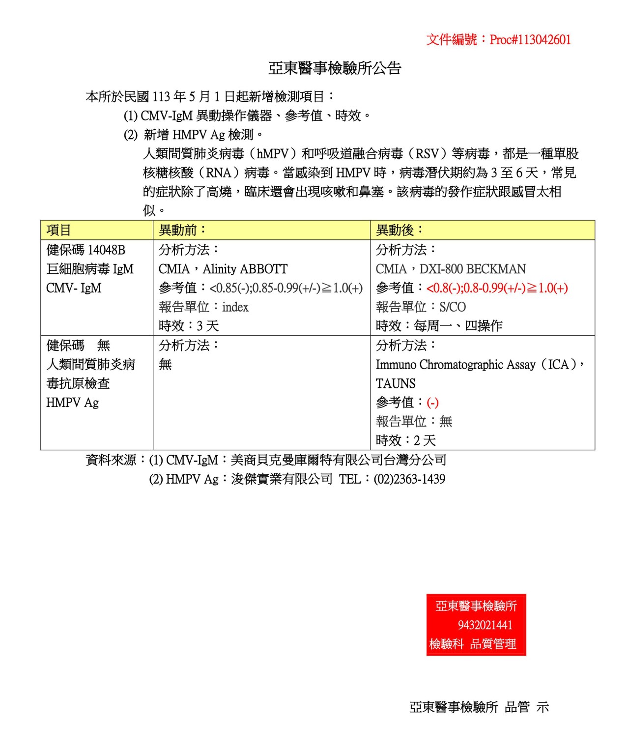 公告 (1) CMV-IgM異動操作儀器、參考值、時效。 (2) 新增HMPV Ag檢測。