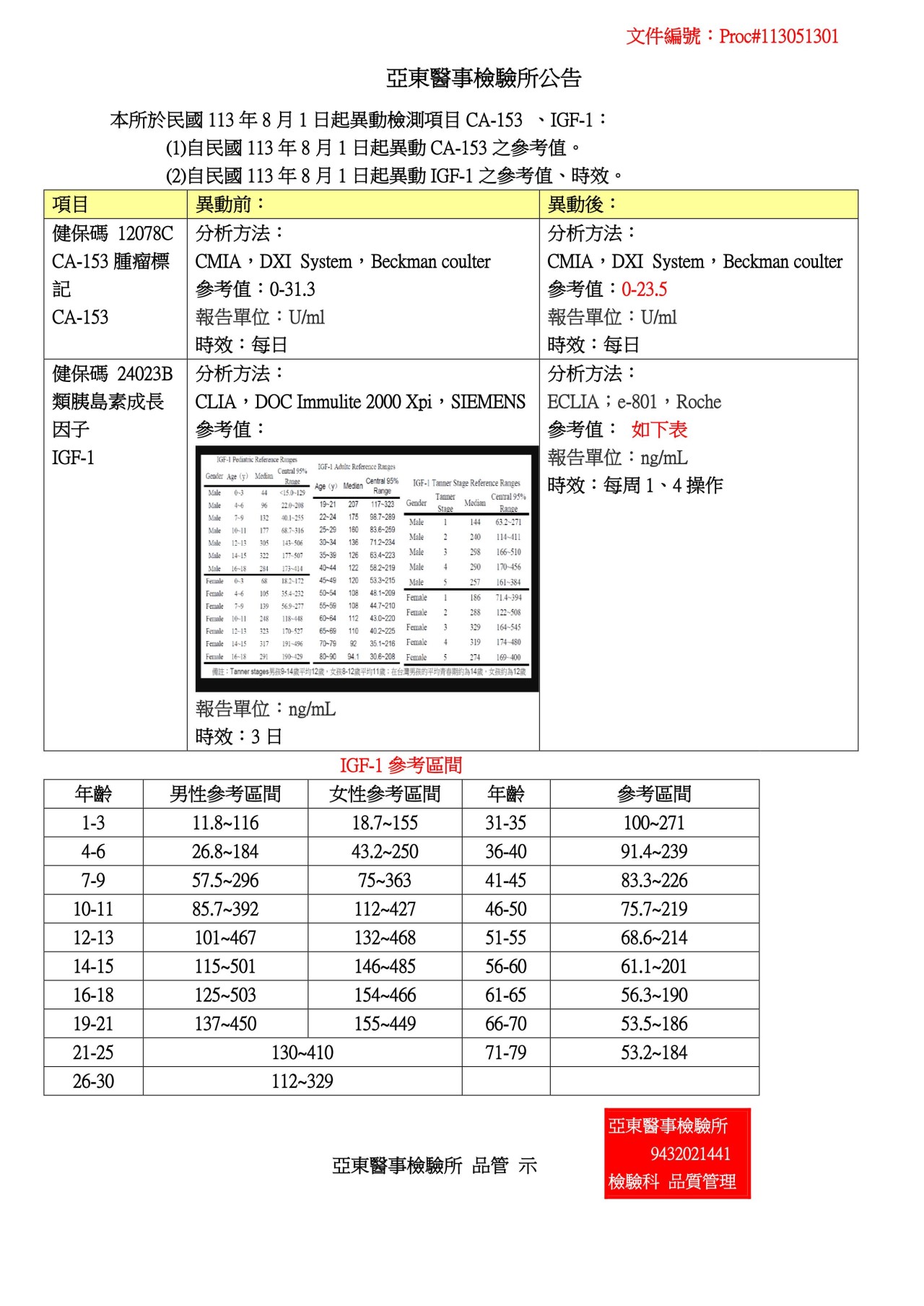 公告 本所於民國113年8月1日起異動檢測項目CA-153 、IGF-1