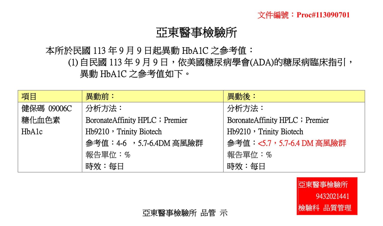 公告 本所於民國113年9月9日起異動HbA1C之參考值