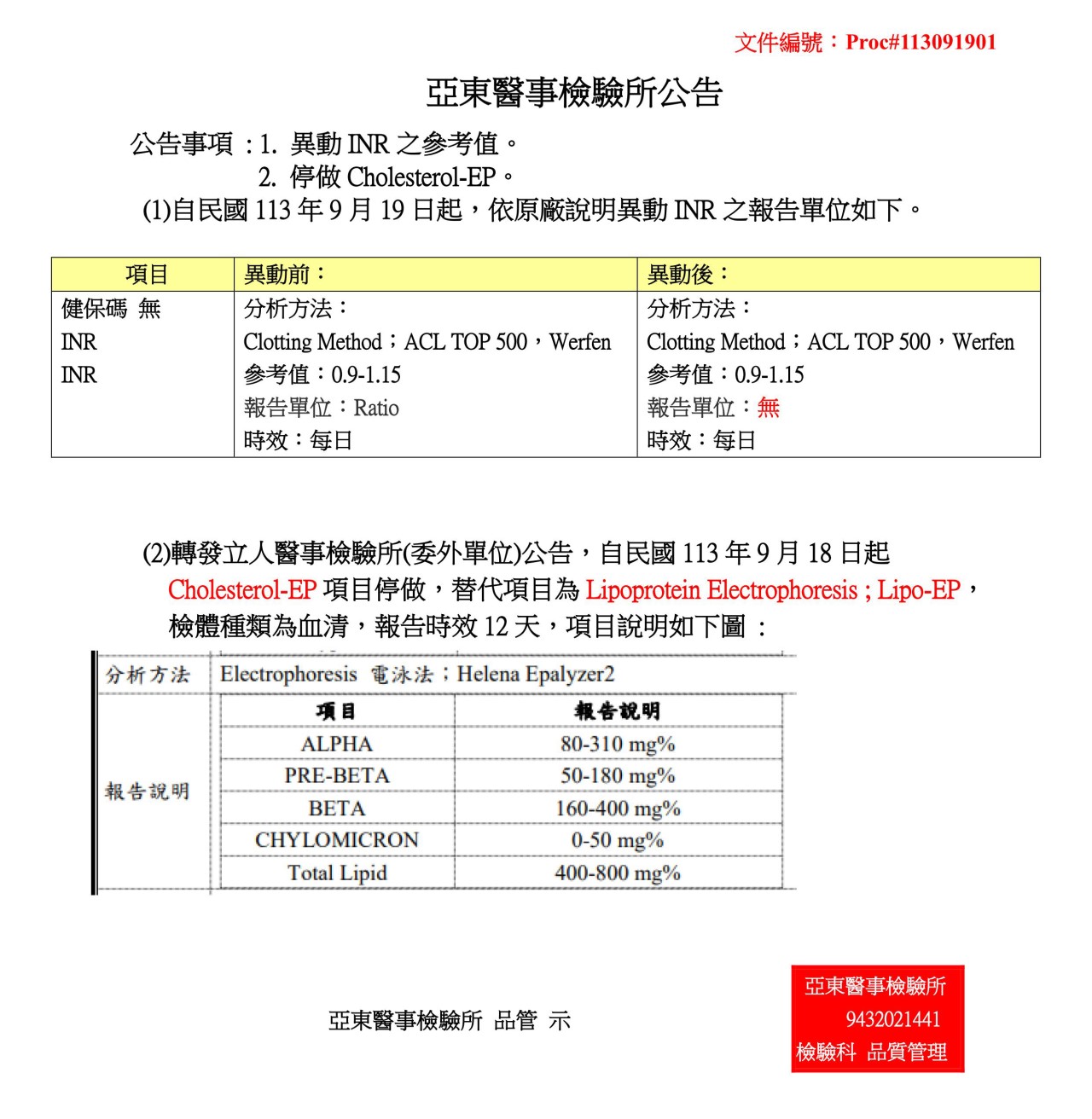 公告 1. 異動INR之參考值。2. 停做Cholesterol-EP。