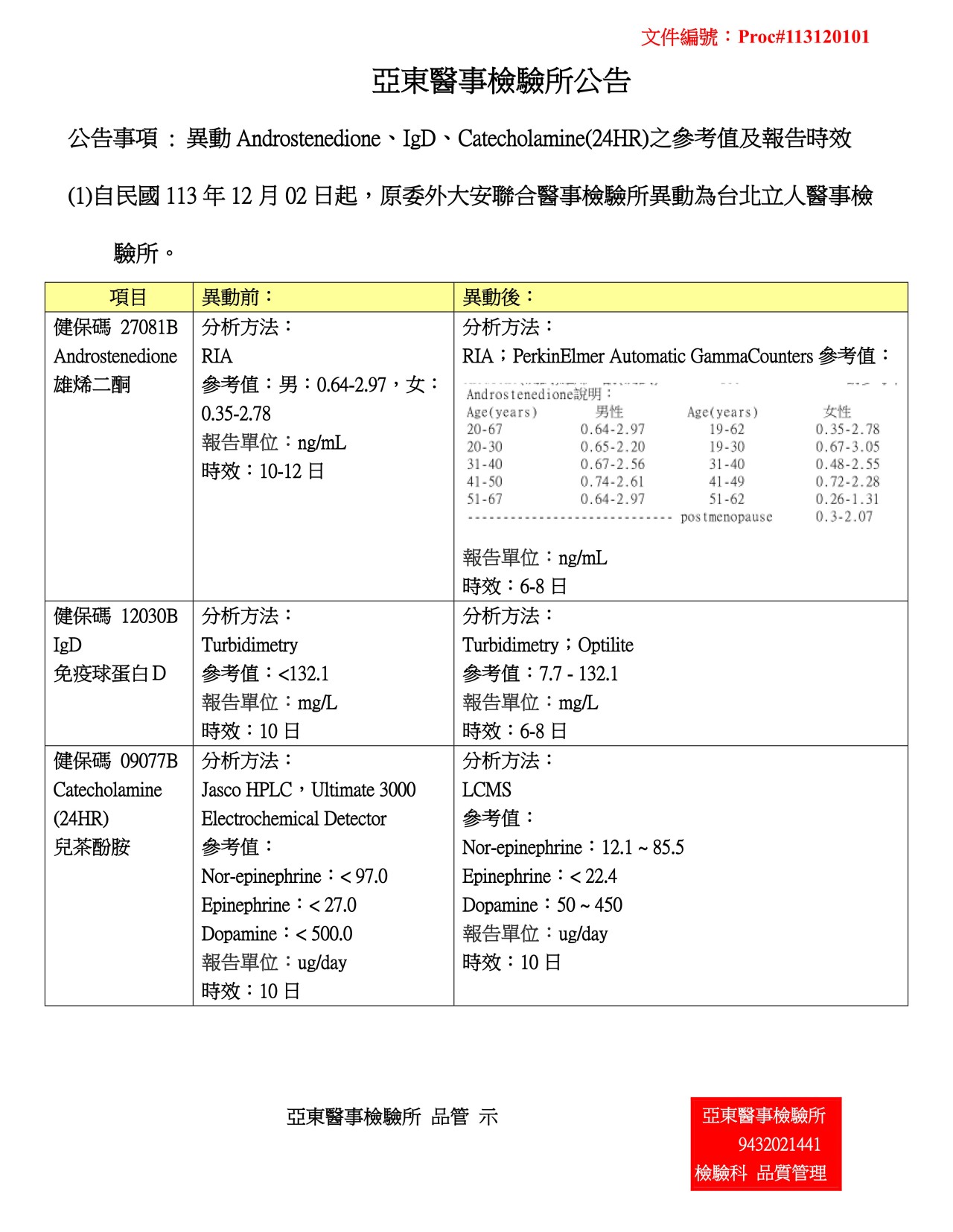 公告 異動Androstenedione、IgD、Catecholamine(24HR)之參考值及報告時效