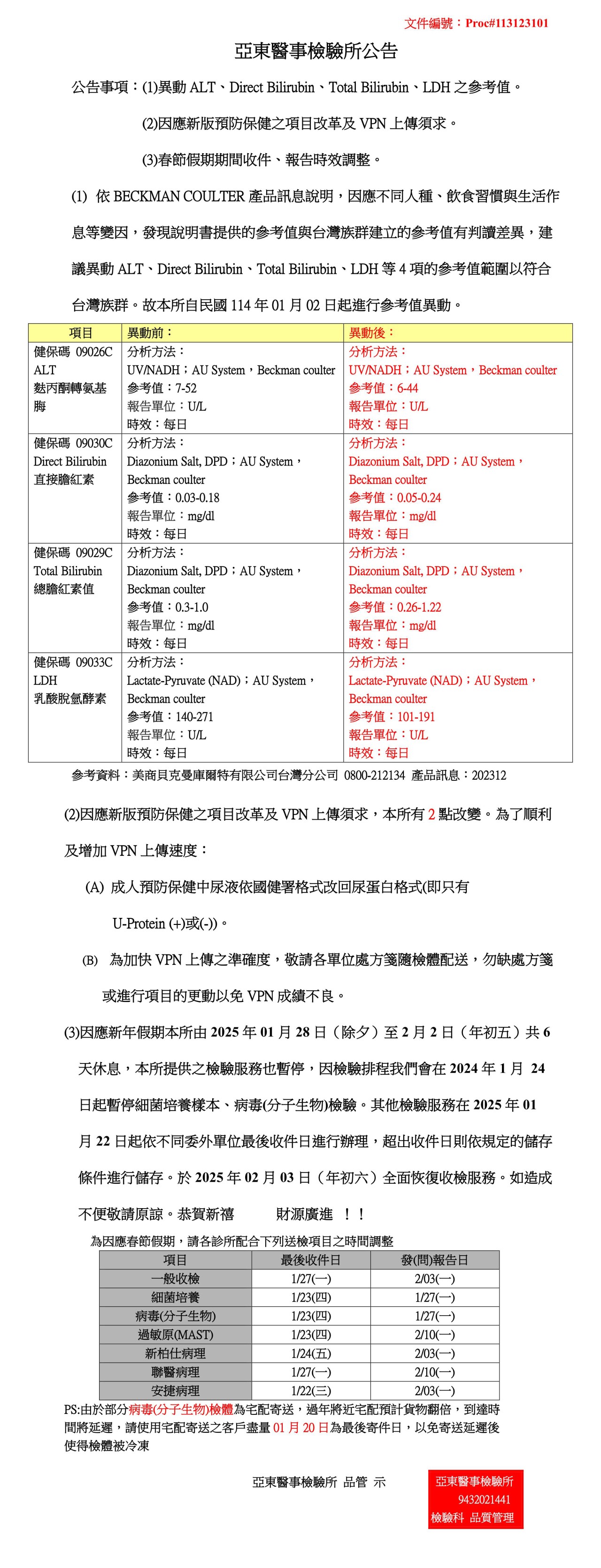 公告 1.異動ALT、Direct ...之參考值。2. 因應新版預防保健... 3.春節假期期間收件...