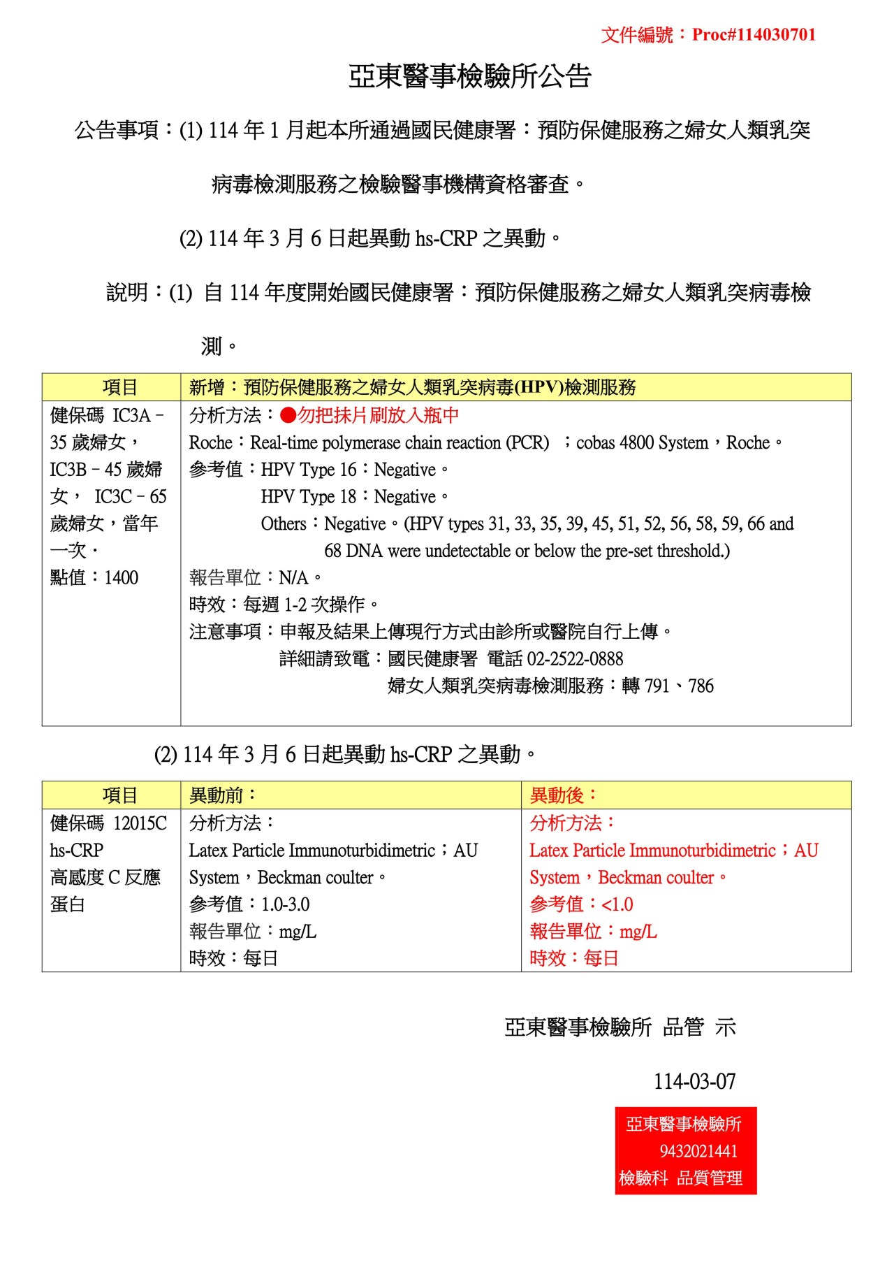 公告 1.114年1月起本所通過國民健康署...檢驗醫事機構資格審查。2. 114年3月6日起異動hs-CRP之異動